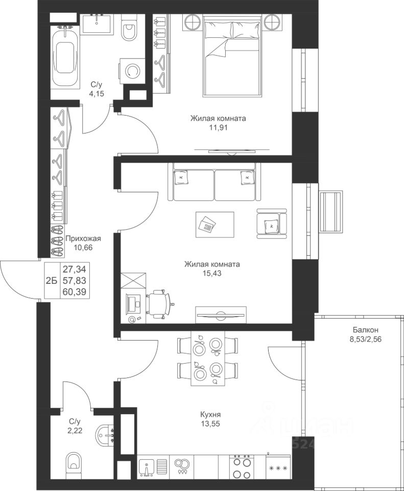 Продается 2-комнатная квартира 27 площадью 60,39 кв.м на 4 этаже в строящемся доме проекта "Новый свет" компании "Ак Барс Дом".
