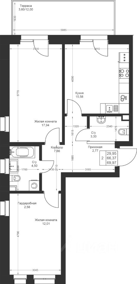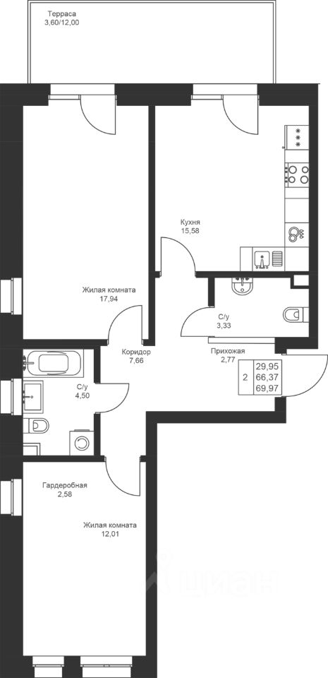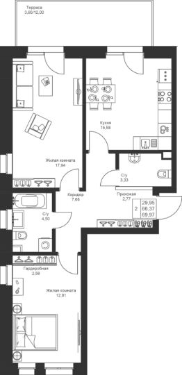 Продается 2-комнатная квартира 3 площадью 69,97 кв.м на 1 этаже в строящемся доме проекта "Новый свет" компании "Ак Барс Дом".