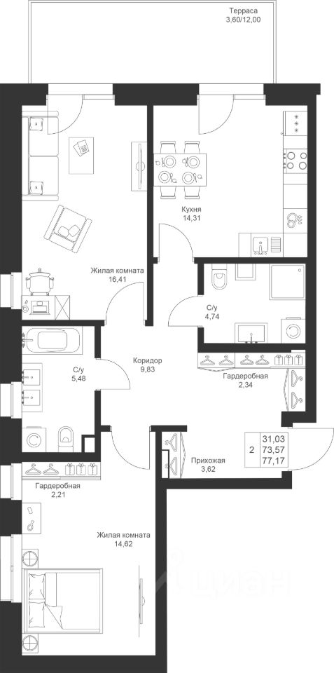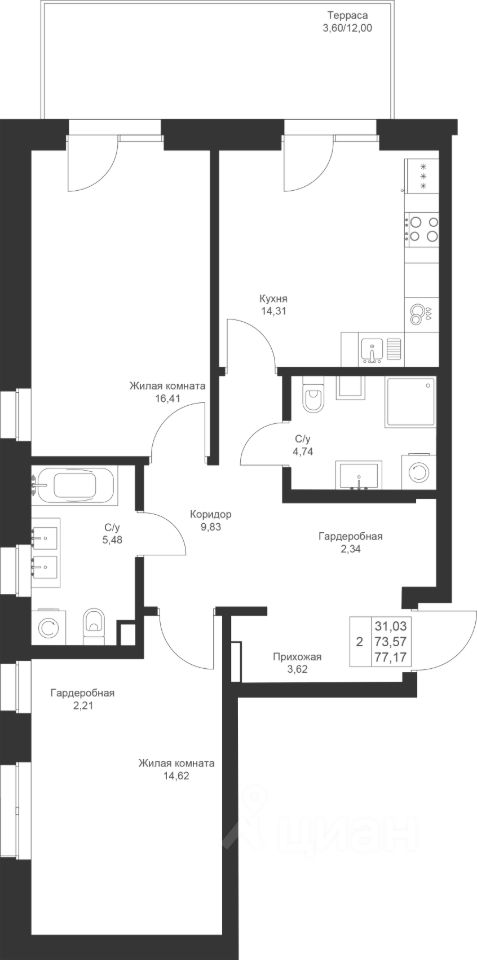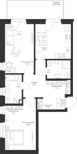 Продается 2-комнатная квартира 16 площадью 77,17 кв.м на 1 этаже в строящемся доме проекта "Новый свет" компании "Ак Барс Дом".
