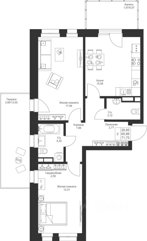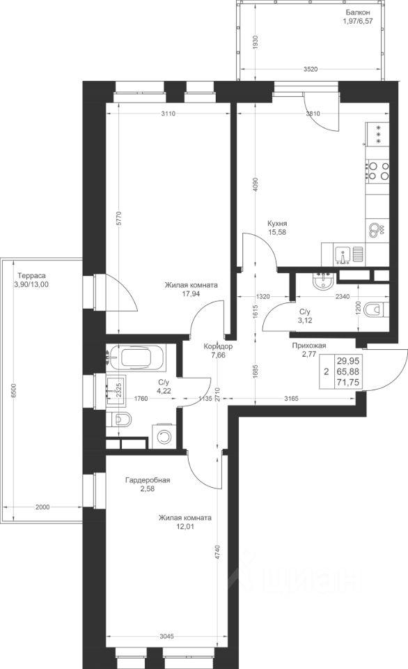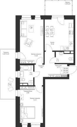 Продается 2-комнатная квартира 79 площадью 71,75 кв.м на 2 этаже в строящемся доме проекта "Новый свет" компании "Ак Барс Дом".