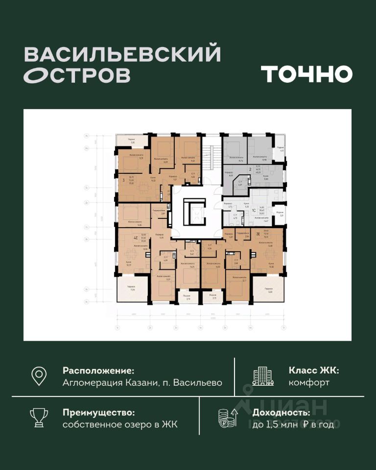ЖК "Васильевский остров" — масштабный проект ТОЧНО в Казанской агломерации. Просторная территория 88 Га спроектирована для комфортной жизни: озеро с набережной и пляжем, каток, зелёные маршруты. В проекте комплекса — школа на 1 224 места, 2 детских сада на 680 мест, детская и взрослая поликлиники, фитнес-центр с бассейном, термальный комплекс, фермерский рынок, магазины, кафе и рестораны.