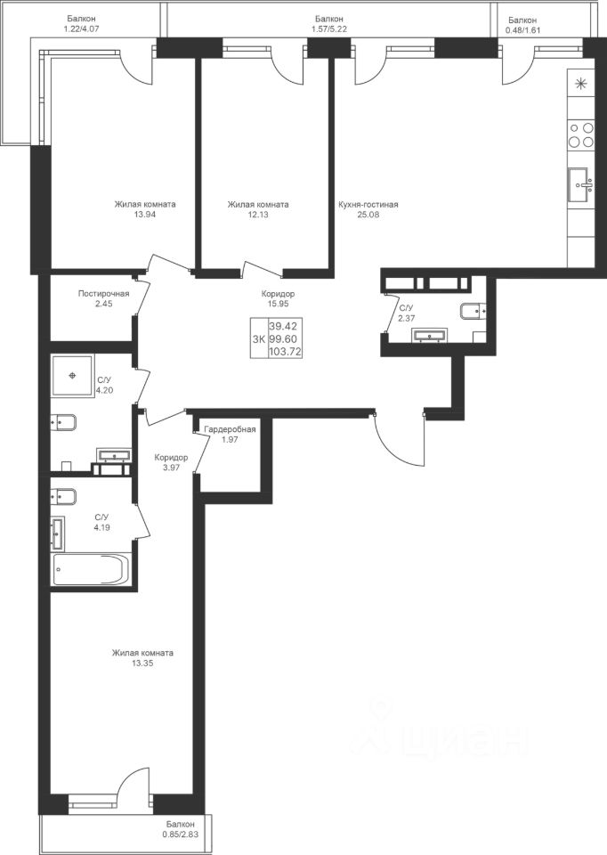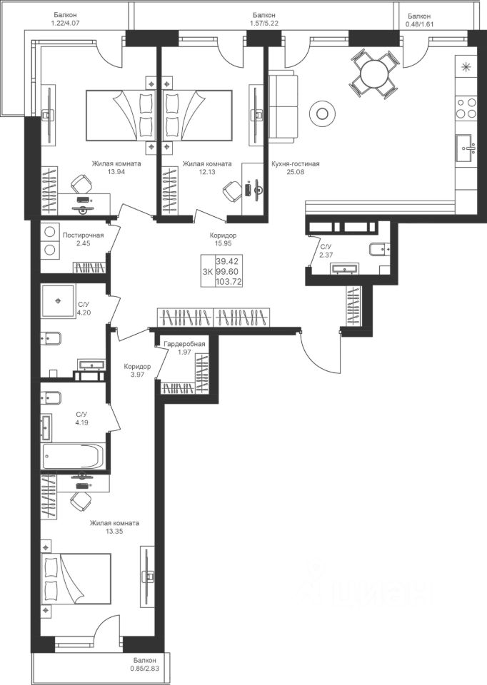 Продается 3 Евро-комнатная квартира 109 площадью 103,72 кв.м на 10 этаже в строящемся доме проекта "Мой Ритм" компании "Ак Барс Дом".