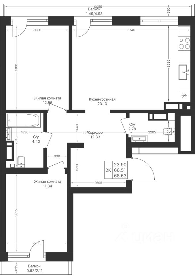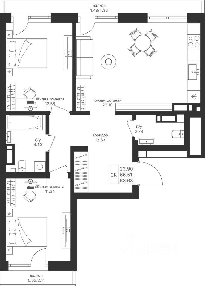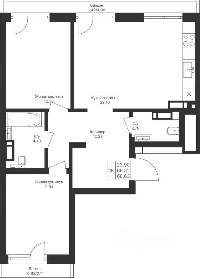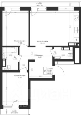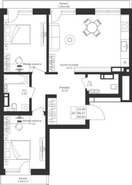 Продается 2 Евро-комнатная квартира 114 площадью 68,63 кв.м на 2 этаже в строящемся доме проекта "Мой Ритм" компании "Ак Барс Дом".