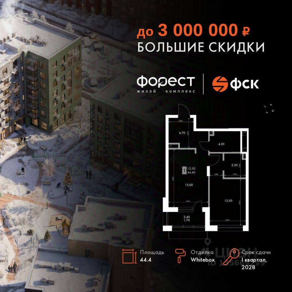 Продаётся 1-к квартира номер 11 общей площадью 44.4 кв.м. на 3-м этаже 6 этажного здания. Отделка Whitebox. Цена с учётом скидки.