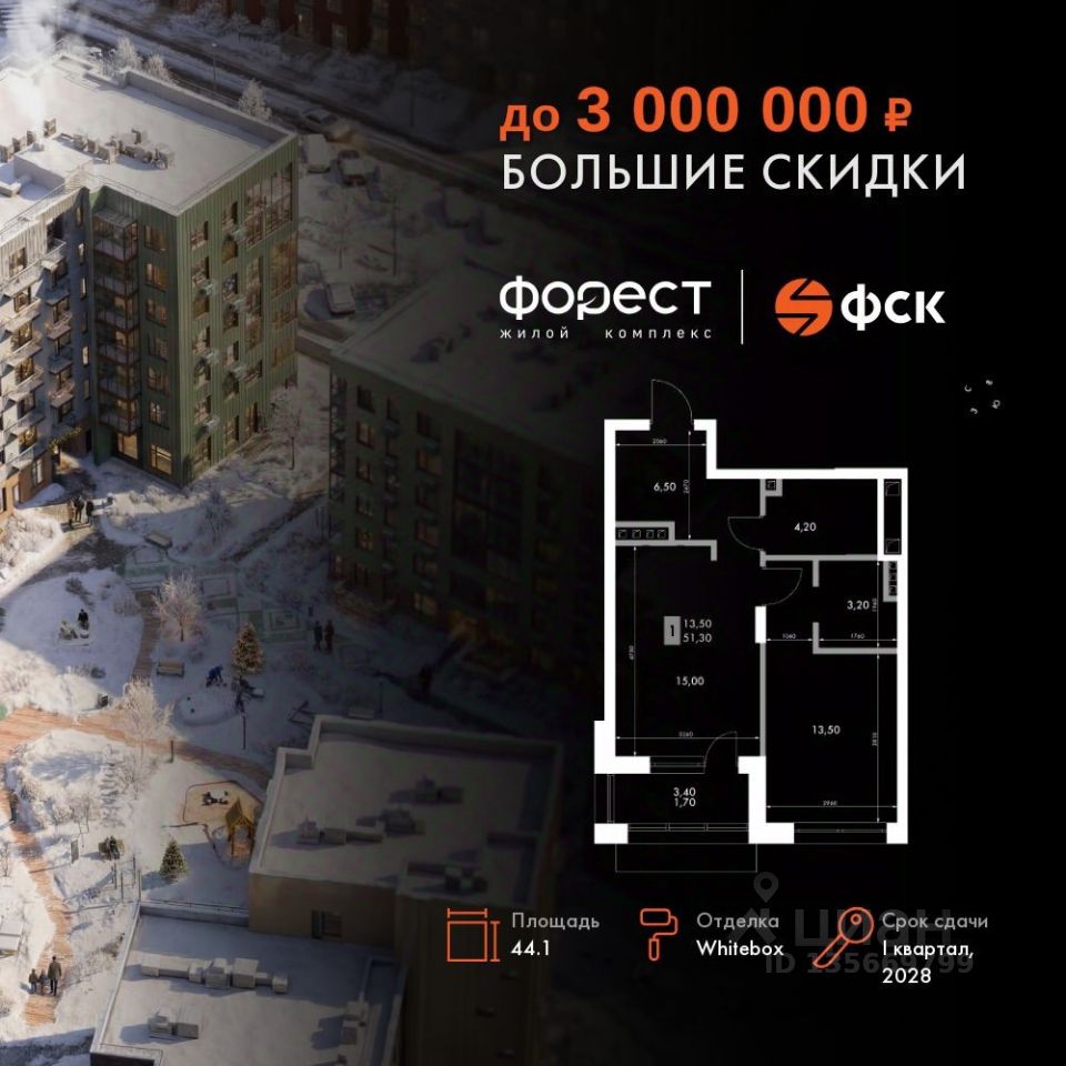 Продаётся 1-к квартира номер 23 общей площадью 44.1 кв.м. на 5-м этаже 6 этажного здания. Отделка Whitebox. Цена с учётом скидки.