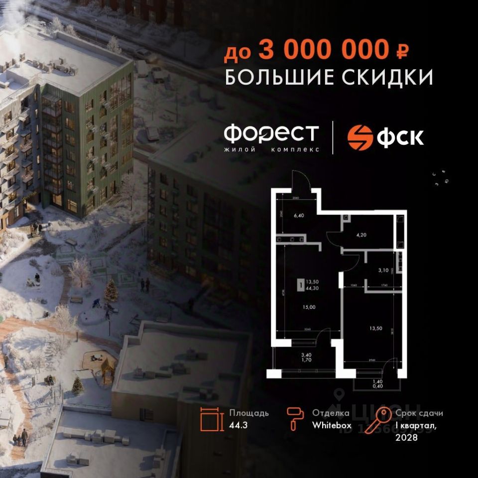 Продаётся 1-к квартира номер 29 общей площадью 44.3 кв.м. на 6-м этаже 6 этажного здания. Отделка Whitebox. Цена с учётом скидки.