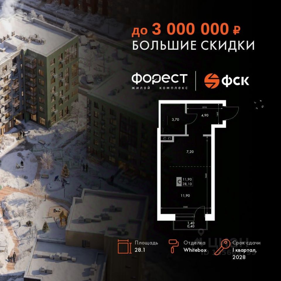 Продаётся 1-к квартира номер 39 общей площадью 28.1 кв.м. на 2-м этаже 6 этажного здания. Отделка Whitebox. Цена с учётом скидки.