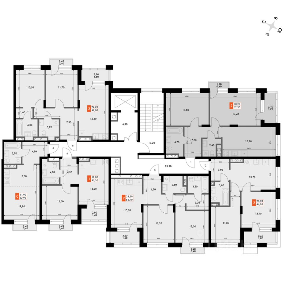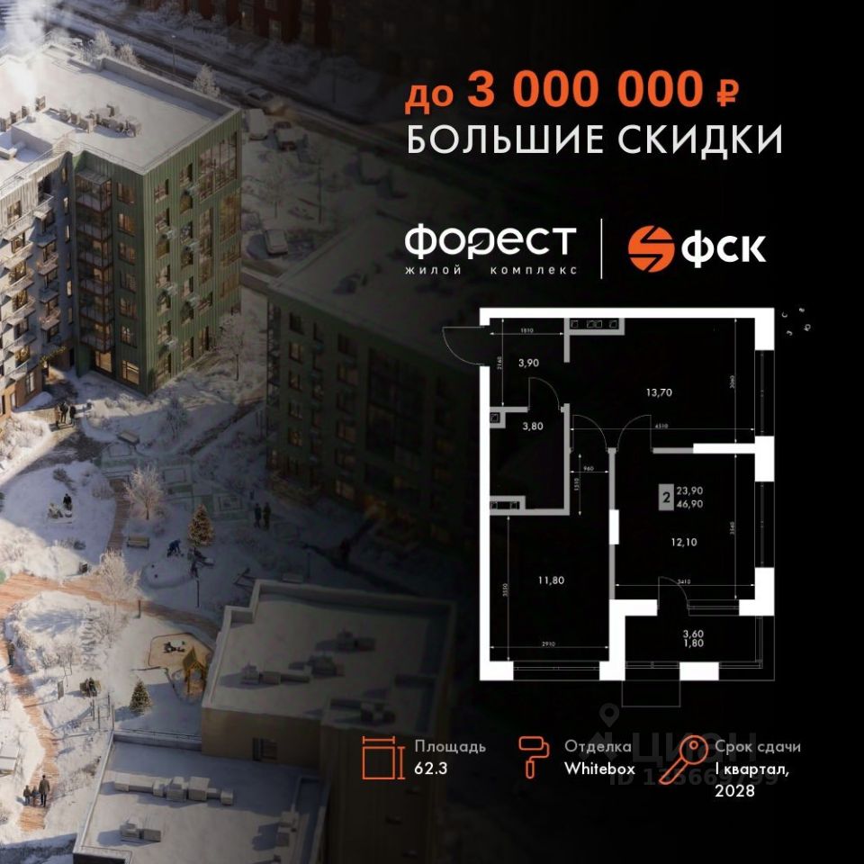 Продаётся 2-к квартира номер 47 общей площадью 62.3 кв.м. на 4-м этаже 6 этажного здания. Отделка Whitebox. Цена с учётом скидки.