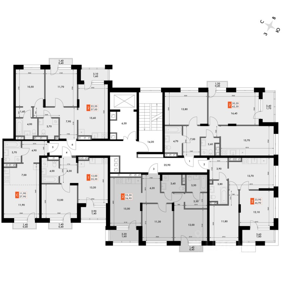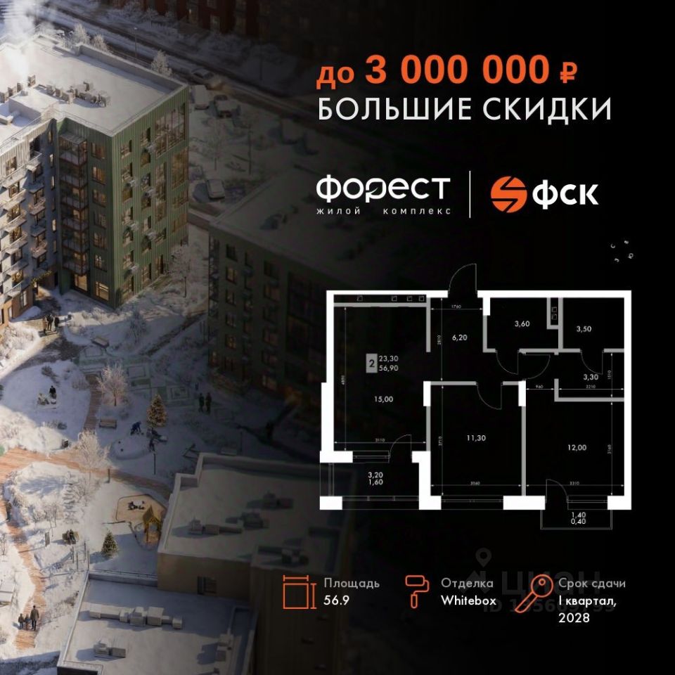 Продаётся 2-к квартира номер 49 общей площадью 56.9 кв.м. на 4-м этаже 6 этажного здания. Отделка Whitebox. Цена с учётом скидки.