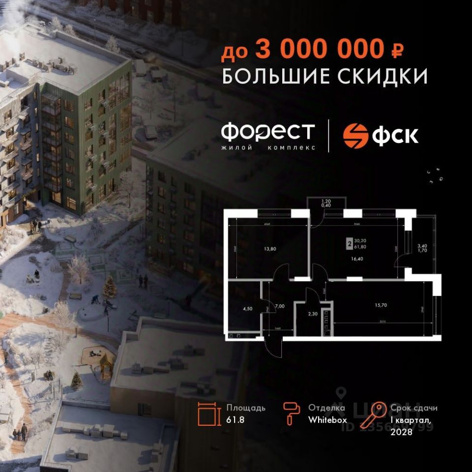 Продаётся 2-к квартира номер 53 общей площадью 61.8 кв.м. на 5-м этаже 6 этажного здания. Отделка Whitebox. Цена с учётом скидки.