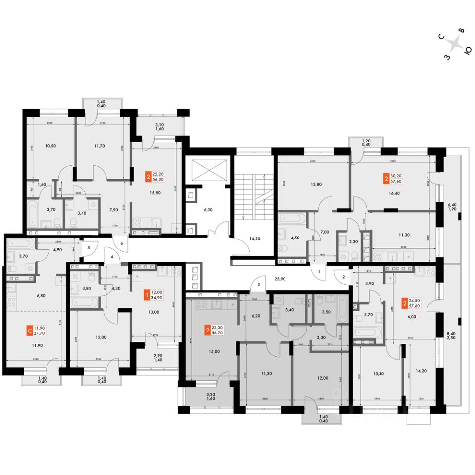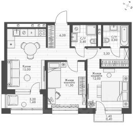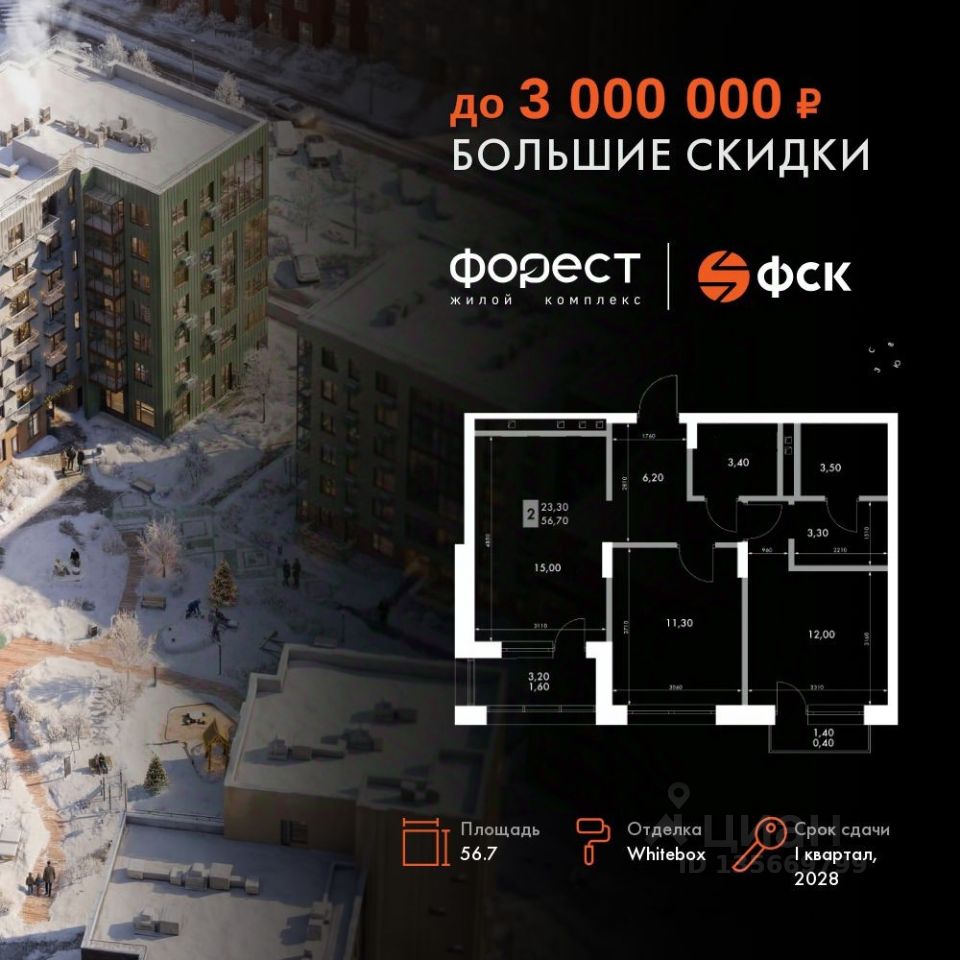 Продаётся 2-к квартира номер 61 общей площадью 56.7 кв.м. на 6-м этаже 6 этажного здания. Отделка Whitebox. Цена с учётом скидки.