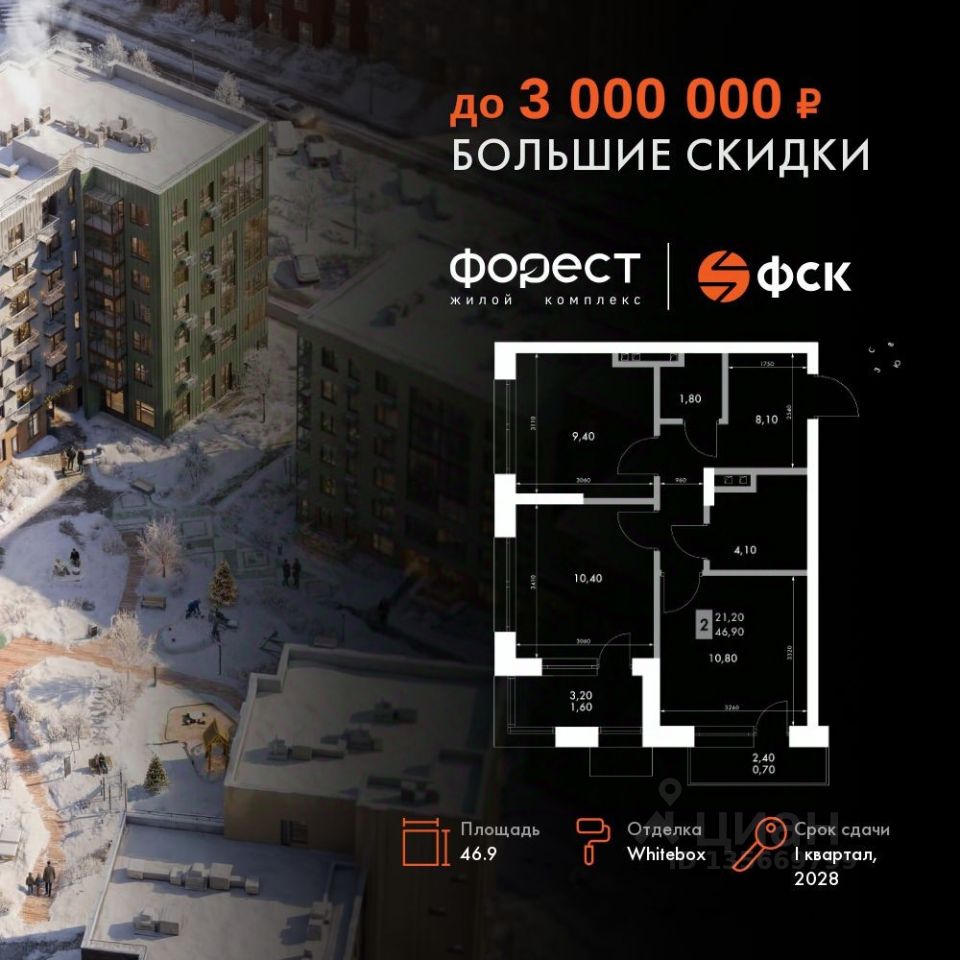 Продаётся 2-к квартира номер 8 общей площадью 46.9 кв.м. на 2-м этаже 6 этажного здания. Отделка Whitebox. Цена с учётом скидки.