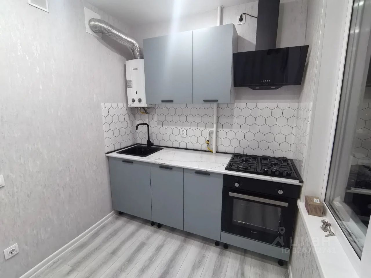 В квартире остается кухонный гарнитур со встроенной техникой.