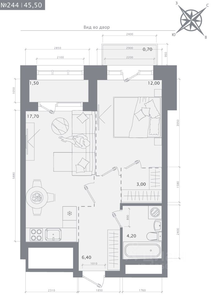 Продаётся 1-комнатная квартира в строящемся доме (Дом 2), срок сдачи: IV-кв. 2027, общей площадью 45.5 кв.м., на 6 этаже.