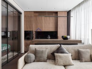 Максимально продуманное расположение комнат: уютная кухня - гостиная, с функциональной кухонной зоной, с панорамным остеклением и зоной ТВ, из окон которой открывает шикарный вид на Кремлевскую набережную, мост Милениум и р. Казанку; уютная спальня со стильной туалетной комната, с душевой зоной. В дизайне использован высококачественный шпон дуба, кухня из натурального дуба и натурального мрамора травертин, раковины натуральный мрамор, откосы натуральный шпон дуба, инженерная доска, в доме канальная система кондиционирования и управления климатом, автоматизация электрики, датчики протечки, электрокарнизы, система умного дома.