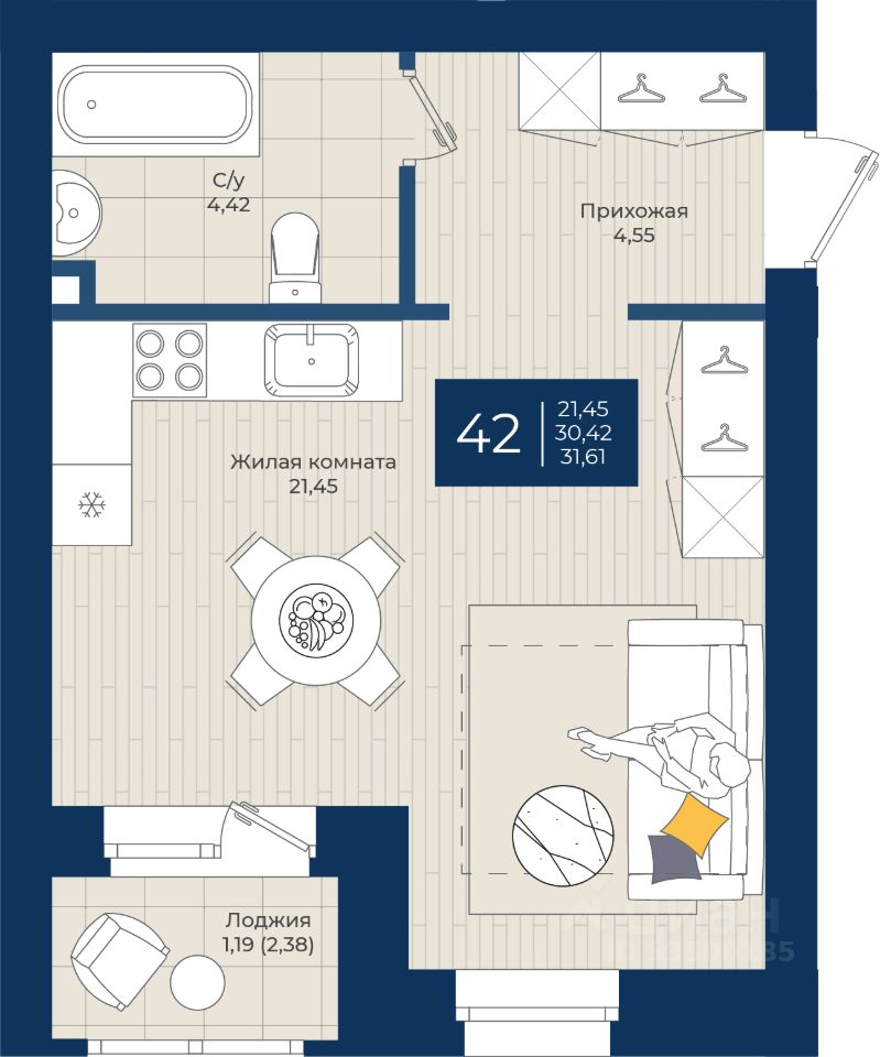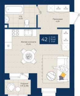 Продаётся студия в строящемся доме (дом 1), срок сдачи: III-кв. 2026, общей площадью 31.61 кв.м., на 4 этаже.