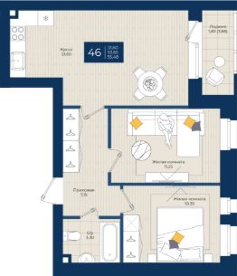 Продаётся 2-комнатная квартира в строящемся доме (дом 1), срок сдачи: III-кв. 2026, общей площадью 55.48 кв.м., на 1 этаже.