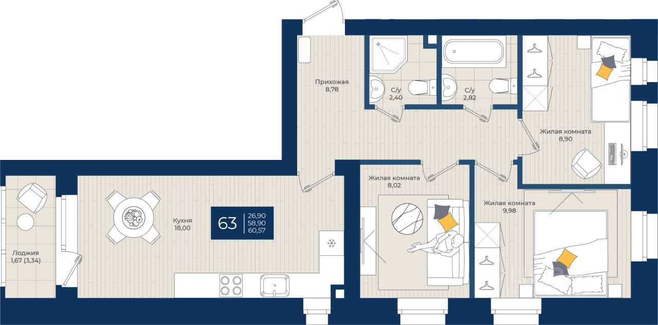 Продаётся 3-комнатная квартира в строящемся доме (дом 1), срок сдачи: III-кв. 2026, общей площадью 60.57 кв.м., на 4 этаже.