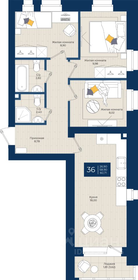 Продаётся 3-комнатная квартира в строящемся доме (дом 2), срок сдачи: III-кв. 2026, общей площадью 60.71 кв.м., на 3 этаже.