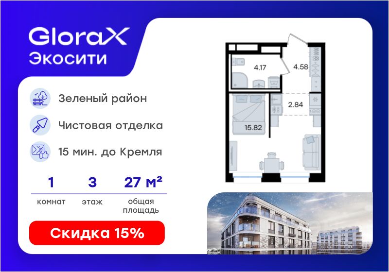 Продаётся студия в строящемся доме (Корпус 2), срок сдачи: I-кв. 2027, общей площадью 27.41 кв.м., на 3 этаже. Проект "GloraX Экосити" - настоящий оазис природы в черте города. Масштабный проект комфорт-класса расположится в спокойном зеленом районе Аракчино Кировского района. Те, кто проезжал это место хорошо знают его красоту и аутентичность.