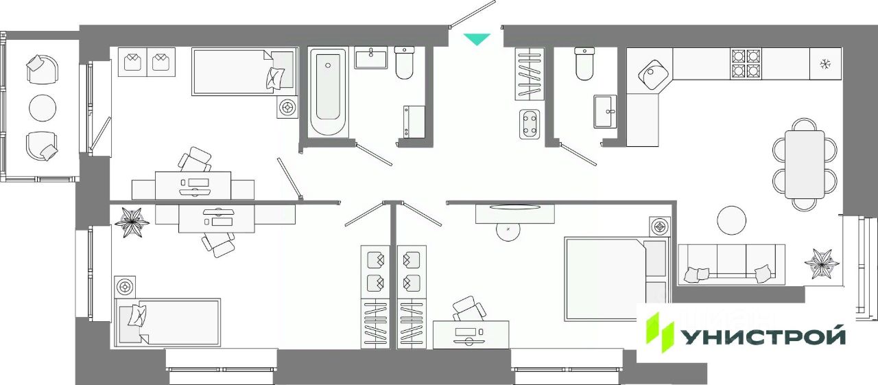 Представлен широкий выбор планировок — от студий до просторных семейных квартир. Доступны варианты с террасами, мастер-спальнями и гардеробными. Во всех квартирах выполнена качественная предчистовая отделка.