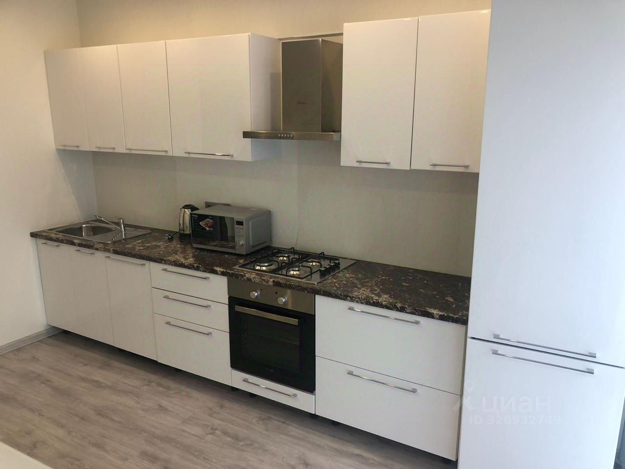 Кухонный гарнитур с варочной панелью, духовым шкафом и вытяжкой. Установлена вся необходимая техника.