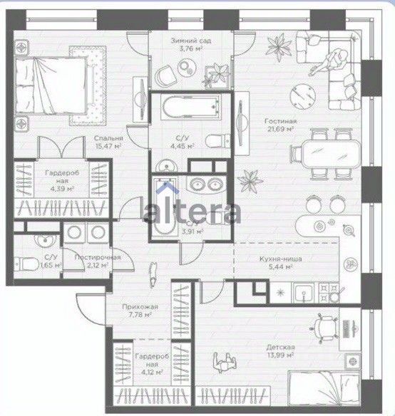 Просторная планировка 88,76 м2: большая кухня - гостиная 27,13 метров, с которой открывается вид на акваторию Казанки; мастер-спальня 15,47м2 со своей гардеробной системой и ванной комнатой; гостевой санузел с постирочной зоной, просторная гардеробная при входе, а также есть возможность сделать зимний сад.