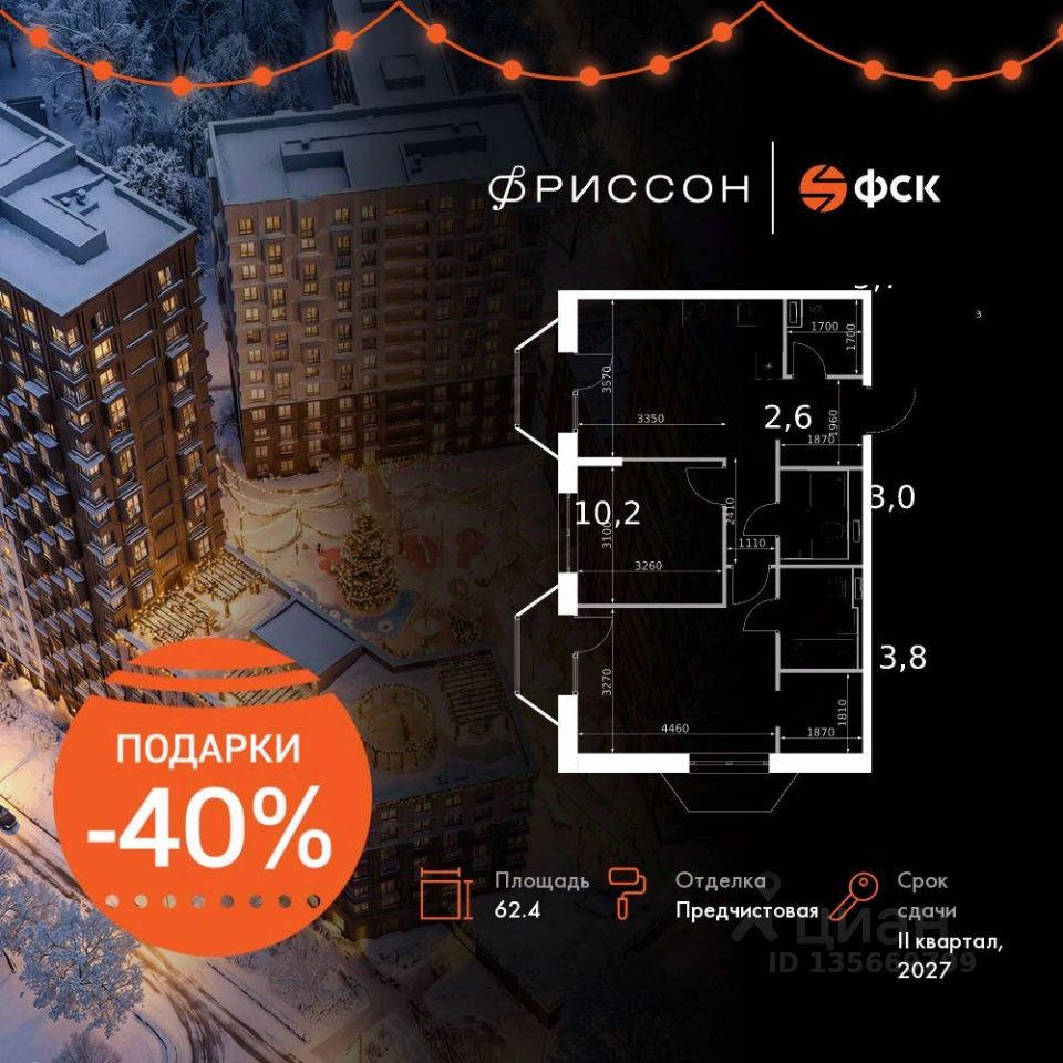 Продаётся 2-к квартира номер 395 общей площадью 62.4 кв.м. на 12-м этаже 14 этажного здания. Отделка Whitebox. Цена с учётом скидки.