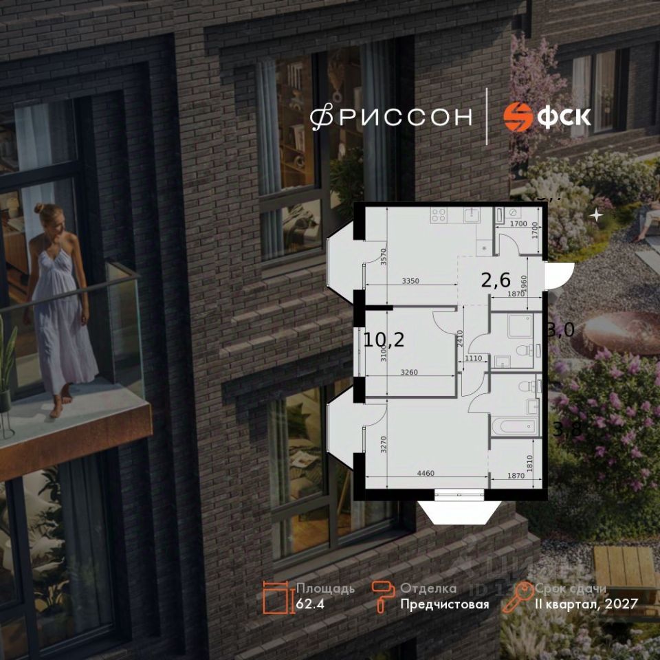 Продаётся 2-к квартира номер 395 общей площадью 62.4 кв.м. на 12-м этаже 14 этажного здания. Предчистовая отделка. Цена с учётом скидки.