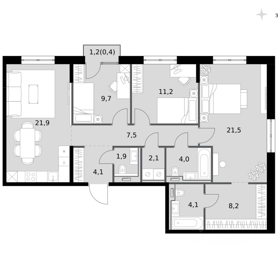 Продаётся 4-к квартира номер 334 общей площадью 96.6 кв.м. на 4-м этаже 14 этажного здания. Отделка Whitebox. Цена с учётом скидки.