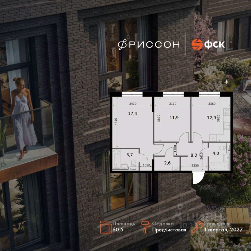 Продаётся 2-к квартира номер 241 общей площадью 60.5 кв.м. на 12-м этаже 19 этажного здания. Предчистовая отделка. Цена с учётом скидки.