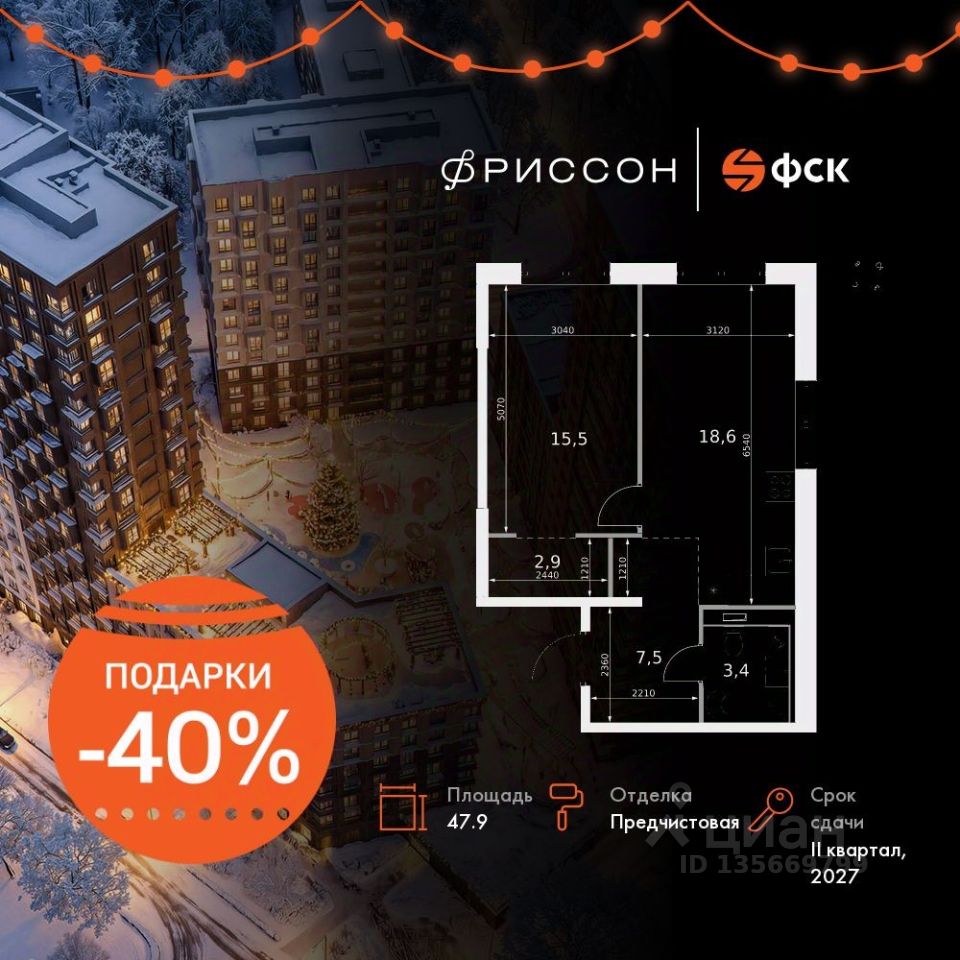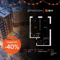 Продаётся 1-к квартира номер 93 общей площадью 47.9 кв.м. на 16-м этаже 20 этажного здания. Предчистовая отделка. Цена с учётом скидки.