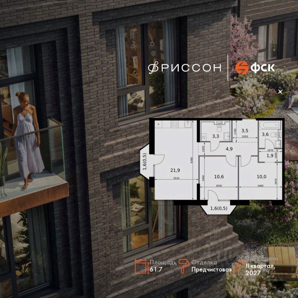 Продаётся 2-к квартира номер 62 общей площадью 61.7 кв.м. на 11-м этаже 20 этажного здания. Предчистовая отделка. Цена с учётом скидки.