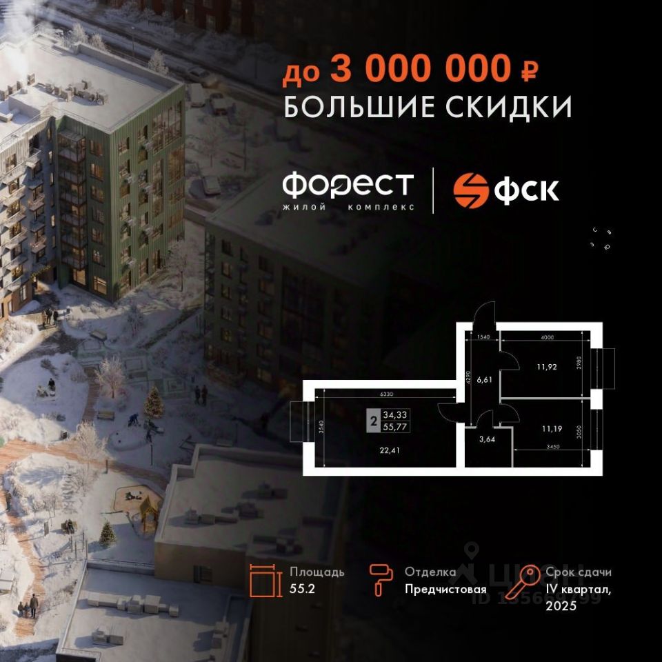 Продаётся 2-к квартира номер 79 общей площадью 55.2 кв.м. на 4-м этаже 4 этажного здания. Предчистовая отделка. Цена с учётом скидки.