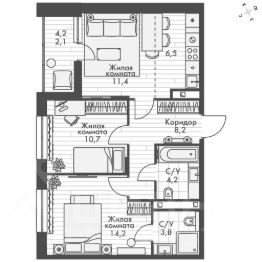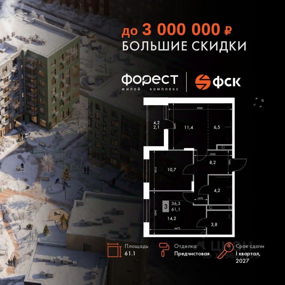 Продаётся 3-к квартира номер 51 общей площадью 61.1 кв.м. на 6-м этаже 7 этажного здания. Отделка Whitebox. Цена с учётом скидки.