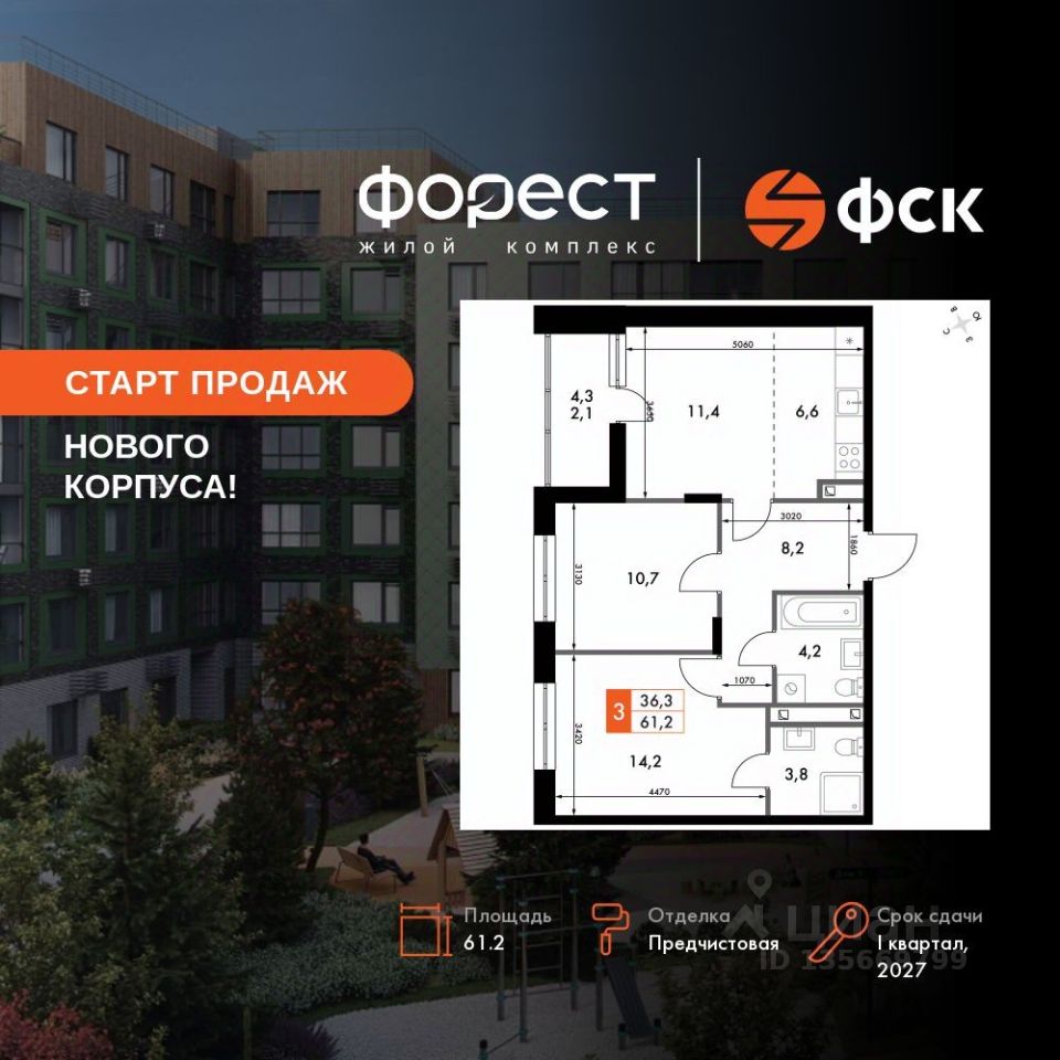 Продаётся 3-к квартира номер 33 общей площадью 61.2 кв.м. на 4-м этаже 7 этажного здания. Предчистовая отделка. Цена с учётом скидки.