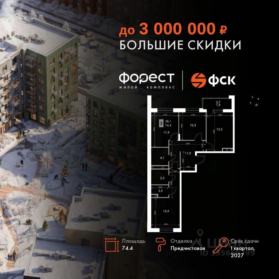 Продаётся 3-к квартира номер 90 общей площадью 74.4 кв.м. на 6-м этаже 6 этажного здания. Предчистовая отделка. Цена с учётом скидки.