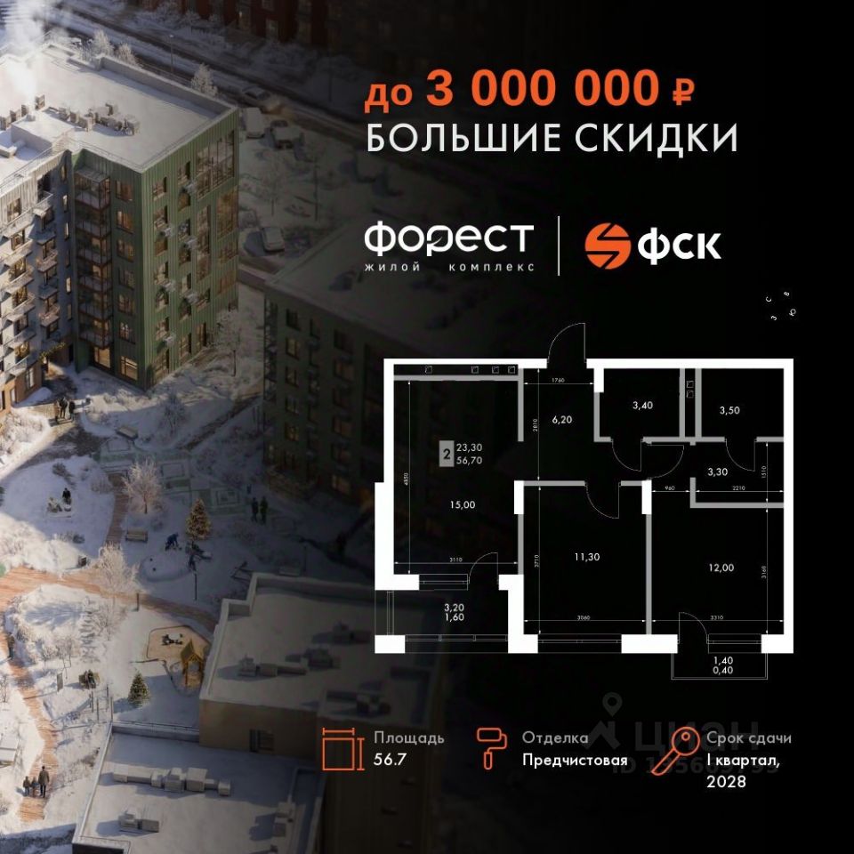 Продаётся 2-к квартира номер 61 общей площадью 56.7 кв.м. на 6-м этаже 6 этажного здания. Предчистовая отделка. Цена с учётом скидки.