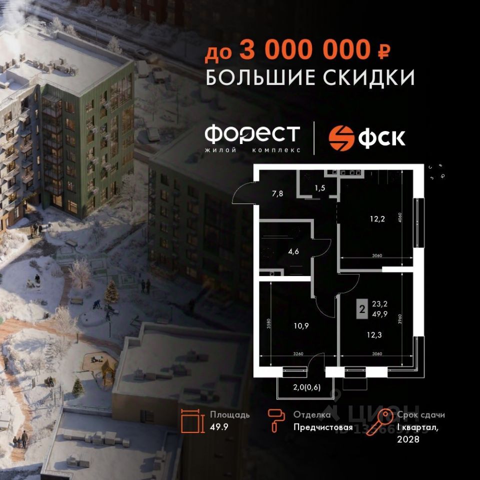 Продаётся 2-к квартира номер 15 общей площадью 49.9 кв.м. на 3-м этаже 5 этажного здания. Отделка Whitebox. Цена с учётом скидки.