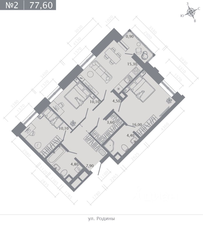 Продаётся 3-комнатная квартира в строящемся доме (Корпус 1), срок сдачи: II-кв. 2028, общей площадью 77.6 кв.м., на 2 этаже.