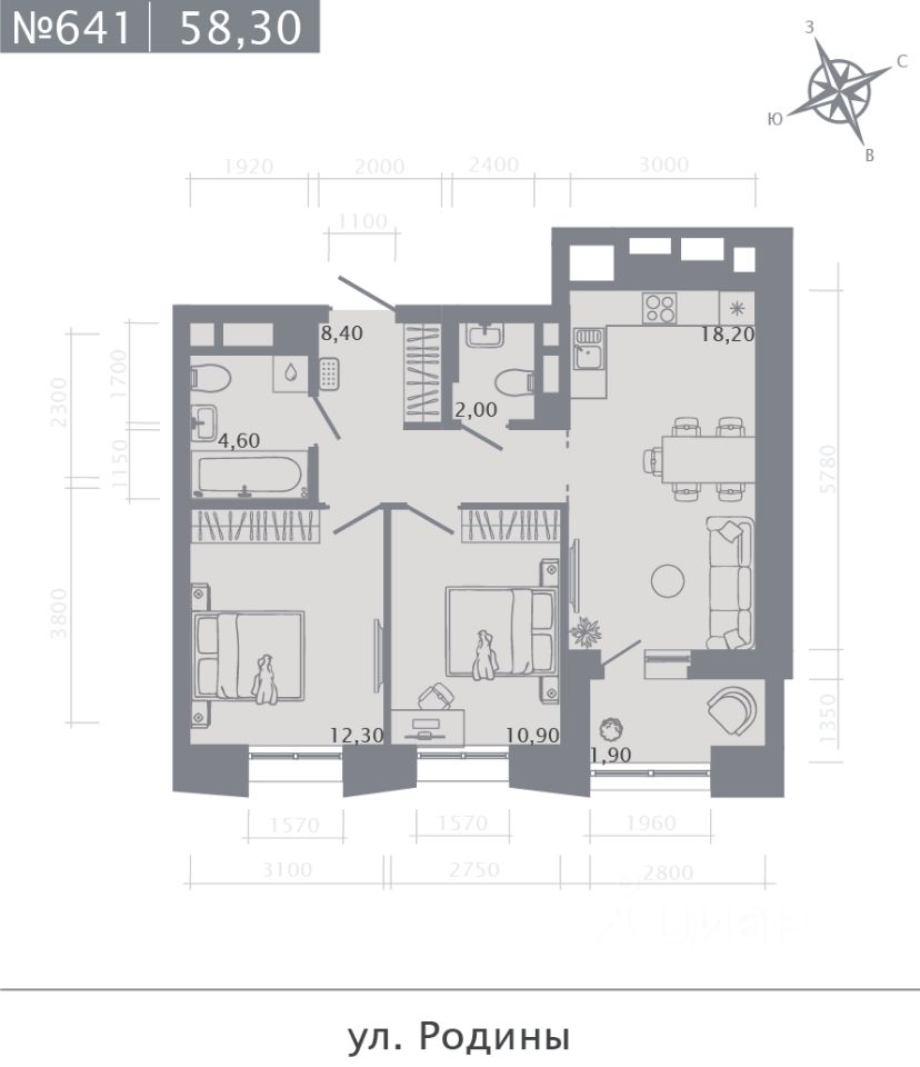 Продаётся 2-комнатная квартира в строящемся доме (Корпус 2), срок сдачи: I-кв. 2029, общей площадью 58.3 кв.м., на 13 этаже.