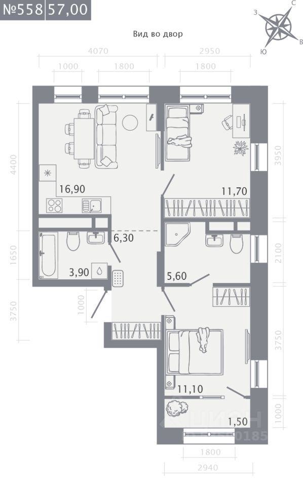 Продаётся 2-комнатная квартира в строящемся доме (Корпус 2), срок сдачи: I-кв. 2029, общей площадью 57 кв.м., на 9 этаже.