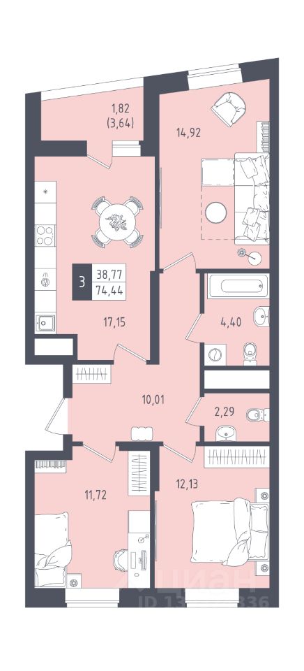 Общая площадь74,44 м²