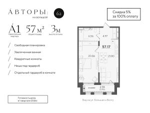 Продается видовая 1-к квартира 14 в клубном доме "Авторы на Большой 62". Квартира с одной спальней на 4 этаже площадью 57.17 м², кухней-гостинной площадью 21.8 м², высотой потолков 3 м. Окна открывают вид на Волгу. Квартира сдается в свободной планировке, предоставляя полную свободу для ваших предпочтений в дизайне и возможность подстроить пространство под ваши жизненные ценности.