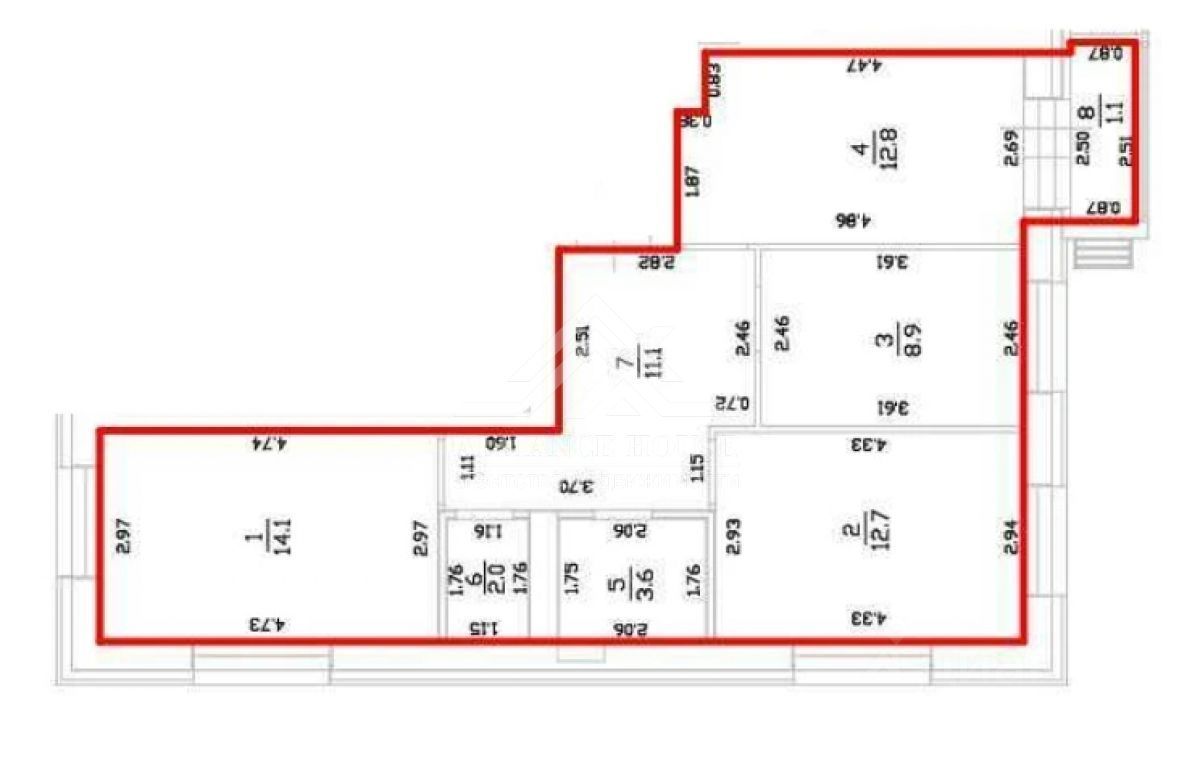 Площадь 65,2 м.кв. , кухня 12,8 м.кв., комнаты 14,1м.кв 12,7м.кв и 8,9м.кв.