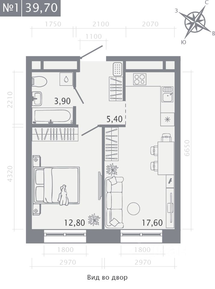 Продаётся 1-комнатная квартира в строящемся доме (Корпус 2), срок сдачи: I-кв. 2029, общей площадью 39.7 кв.м., на 1 этаже.