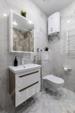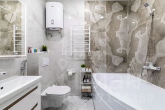 Санузел совмещенный, отделан светлой плиткой, оборудован ванной и водонагревателем.