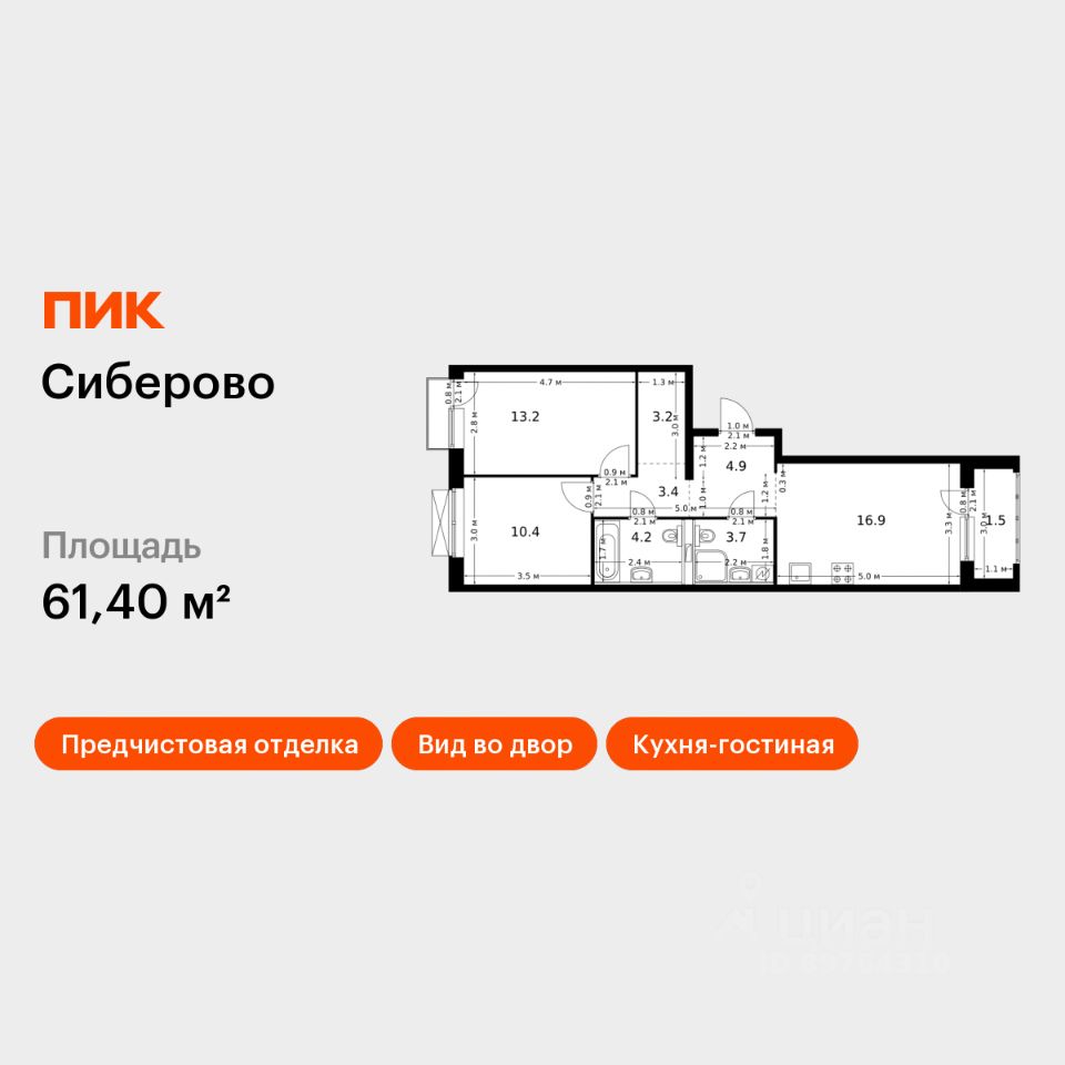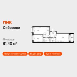 Продаётся 2-комн. квартира площадью 61,4 кв.м на 4 этаже 11 этажного дома (Корпус 1.1, Секция 4) проекта ПИК Сиберово. Светлый просторный подъезд на уровне земли, функциональная планировка, большие окна, предчистовая отделка.