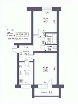 Общая площадь 51,3 кв.м. Гостиная 16,5 кв.м., комната 12,1 кв.м., кухня 7,5 кв.м., с/у разд. лоджия. Квартира укомплектована мебелью и техникой.