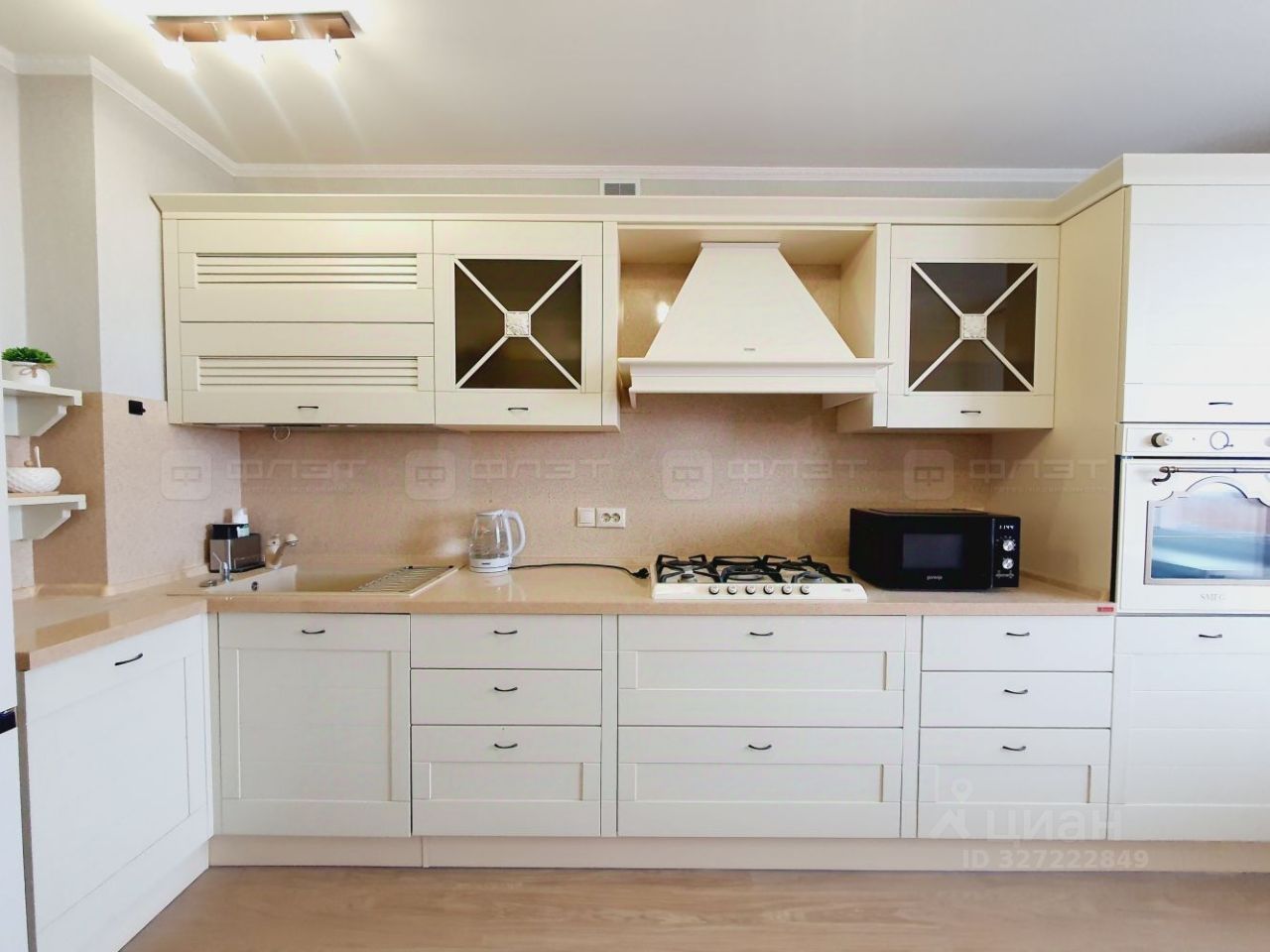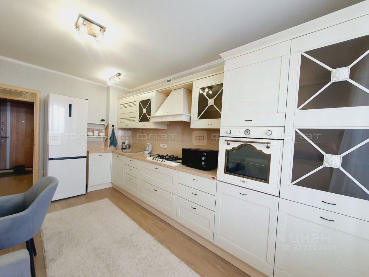 Кухня: просторная, очень светлая. Кухонный гарнитур "Driada" остаётся. Встроенная варочная панель Smeg, встроенный духовой шкаф "Smeg".